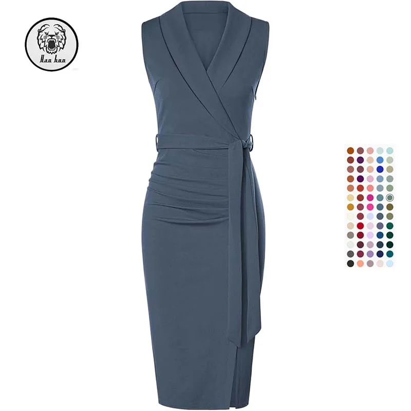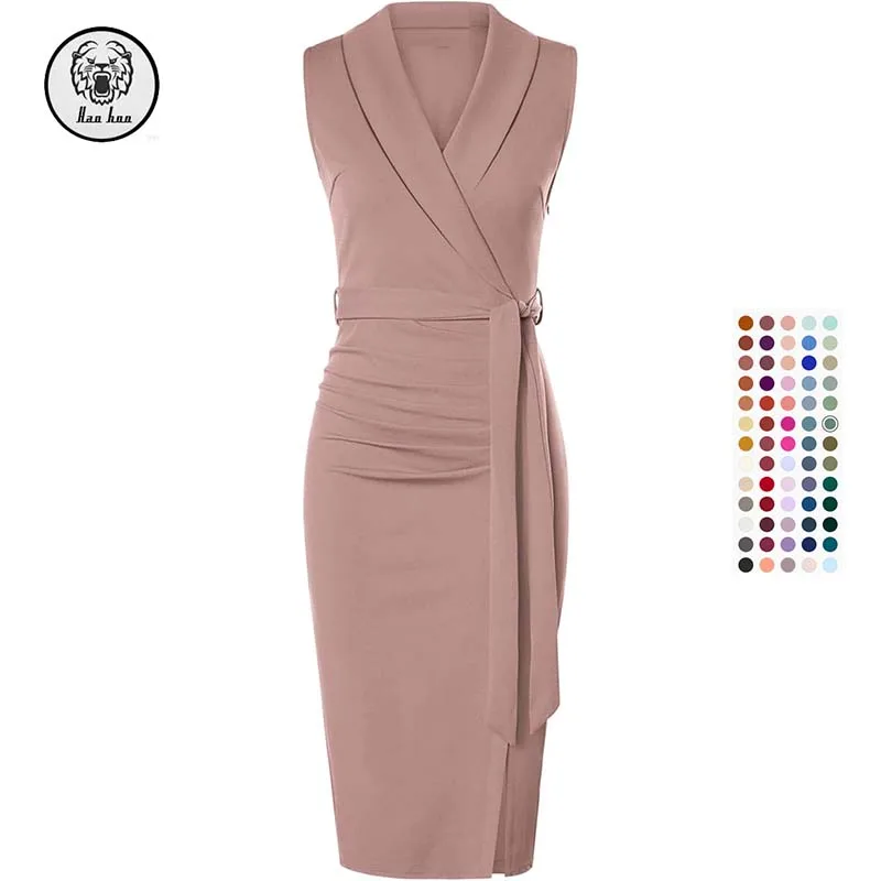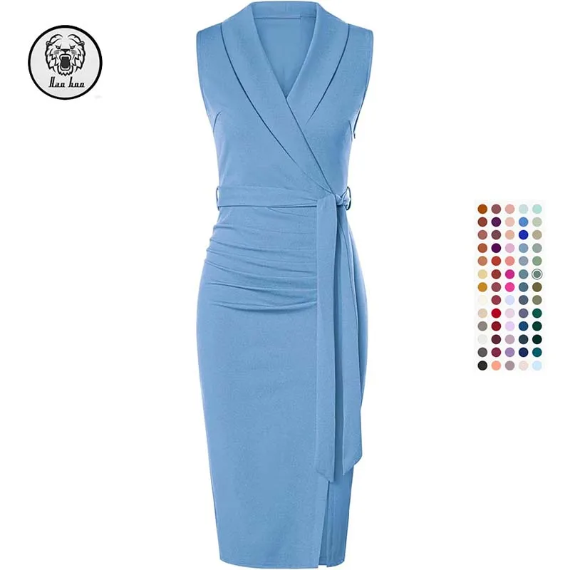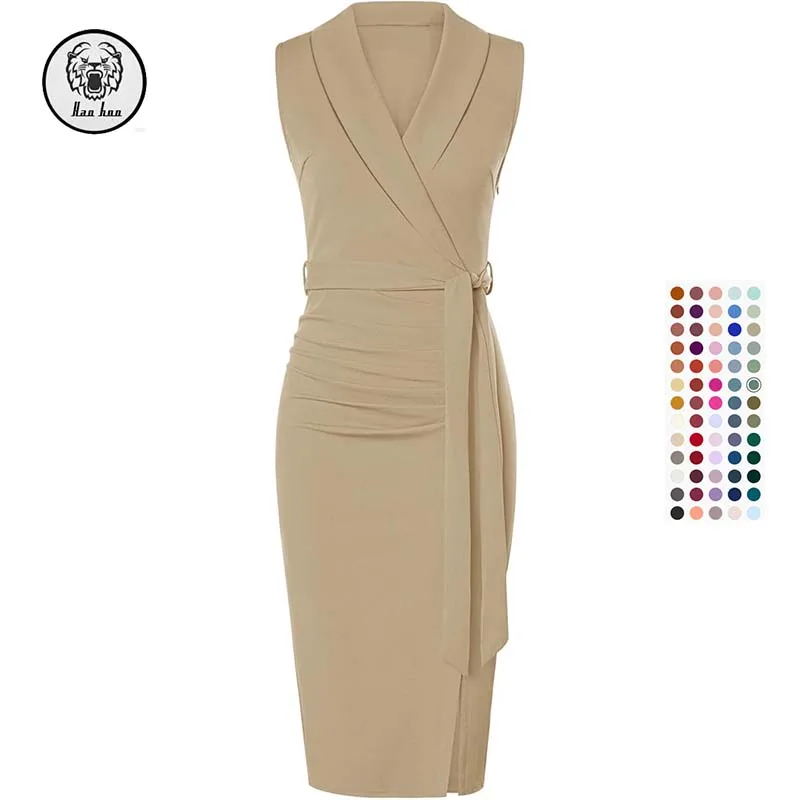 Vestido Casual Women's Bodycon Dress Sleeveless Shawl V-Neck Midi Business Work Dresses with Belt for Cocktail Formal Party